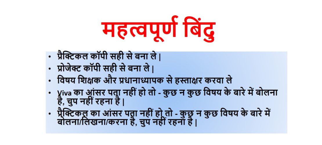 महत्वपूर्ण बिंदु प्रैक्टिकल कॉपी सही से बना ले |प्रोजेक्ट कॉपी सही से बना ले |विषय शिक्षक और प्रधानाध्यापक से हस्ताक्षर करवा लेViva का आंसर पता नहीं हो तो – कुछ न कुछ विषय के बारे में बोलना है, चुप नहीं रहना है |प्रैक्टिकल का आंसर …